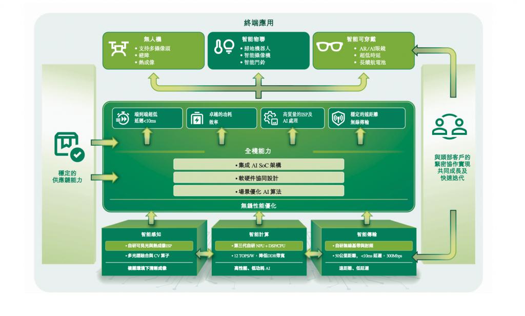 具体而言,在无人机方面,酷芯微在 2012 年进入该领域,其核心产品包括具备融合了可见光及热成像能力的高性能视觉处理 AI SoC,以及先进的无线视频传输 SoC。公司全面的产品组合为智能飞行、远距离视频传输及边缘计算提供集成解决方案,覆盖消费级及工业级全场景低空经济需求。