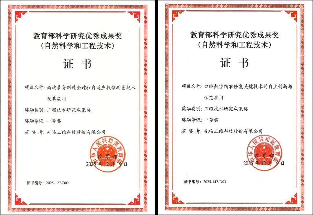 近日,2025 年度教育部科学研究优秀成果奖(自然科学和工程技术)获奖名单正式公布。由先临三维等单位共同完成的两项研究——,凭借在工业测量及齿科数字化领域深厚的科研积累、技术创新及产业化落地应用能力,双双斩获工程技术研究成果奖一等奖。